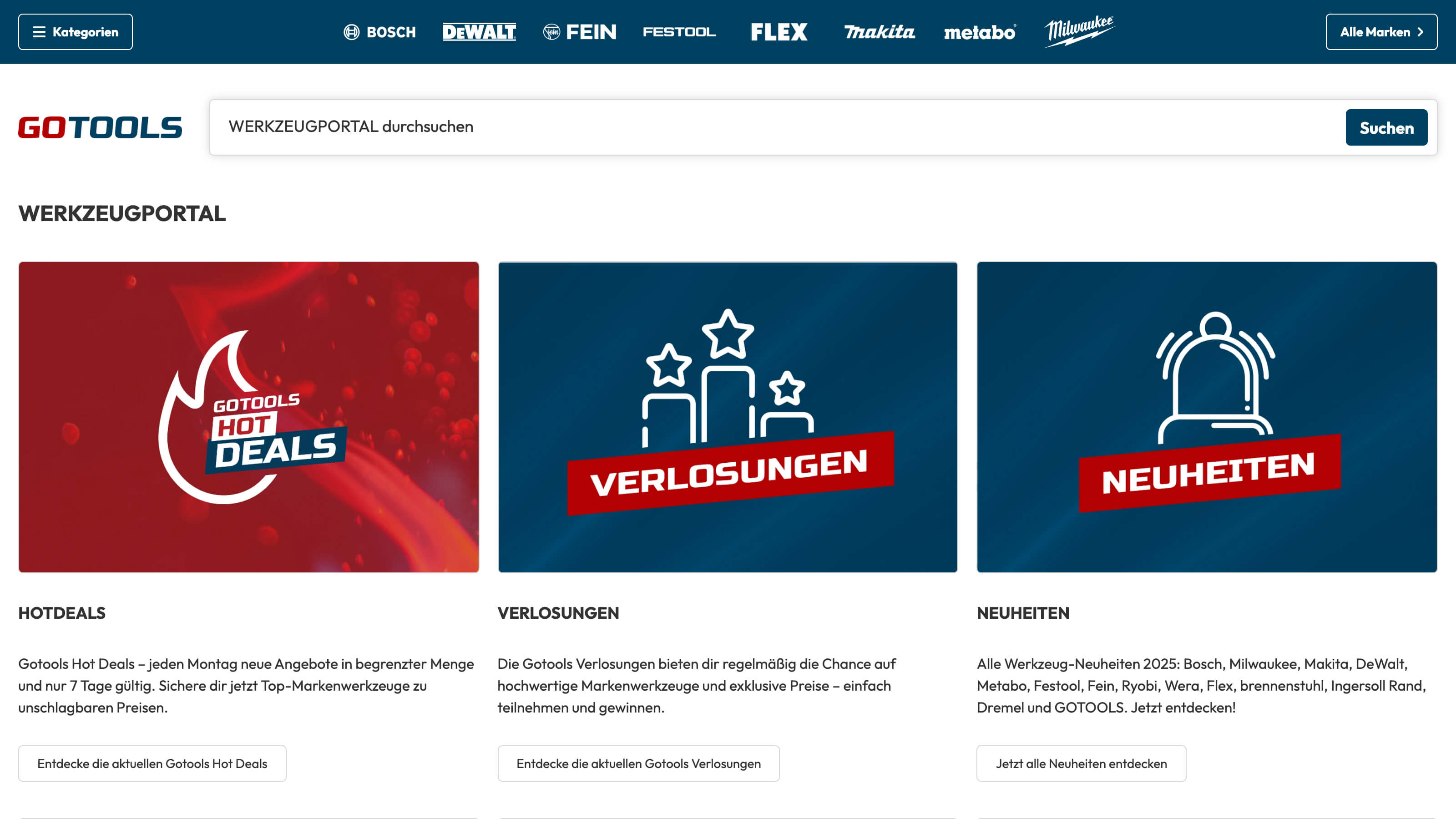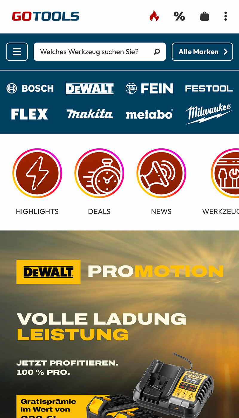 Der Relaunch von Gotools verfolgte das Ziel, die Plattform zur innovativsten und nutzerfreundlichsten Destination für Werkzeugbegeisterte, Hersteller und Markenfans zu machen. Im Mittelpunkt stand die Entwicklung einer hocheffizienten, intelligenten Suchfunktion, die weit mehr leistet als herkömmliche Shop-Suchen. Besonderes Augenmerk lag auf der Vorbereitung aller Contentbereiche und Vergleichsfunktionen für die künftige Integration von KI-Technologien und agentengestützten Beratungsservices. Das Shop-in-Shop-Konzept, die prominente Darstellung von Markenwelten und Herstellerinhalten sowie eine optimale Integration von Vergleichsfunktionen, Content und Aktionen sollten ein ganzheitliches Werkzeug-Erlebnis schaffen – für Kunden, Hersteller und die Community.