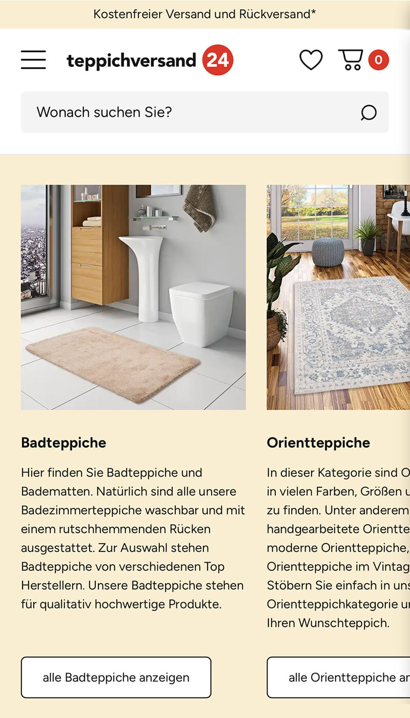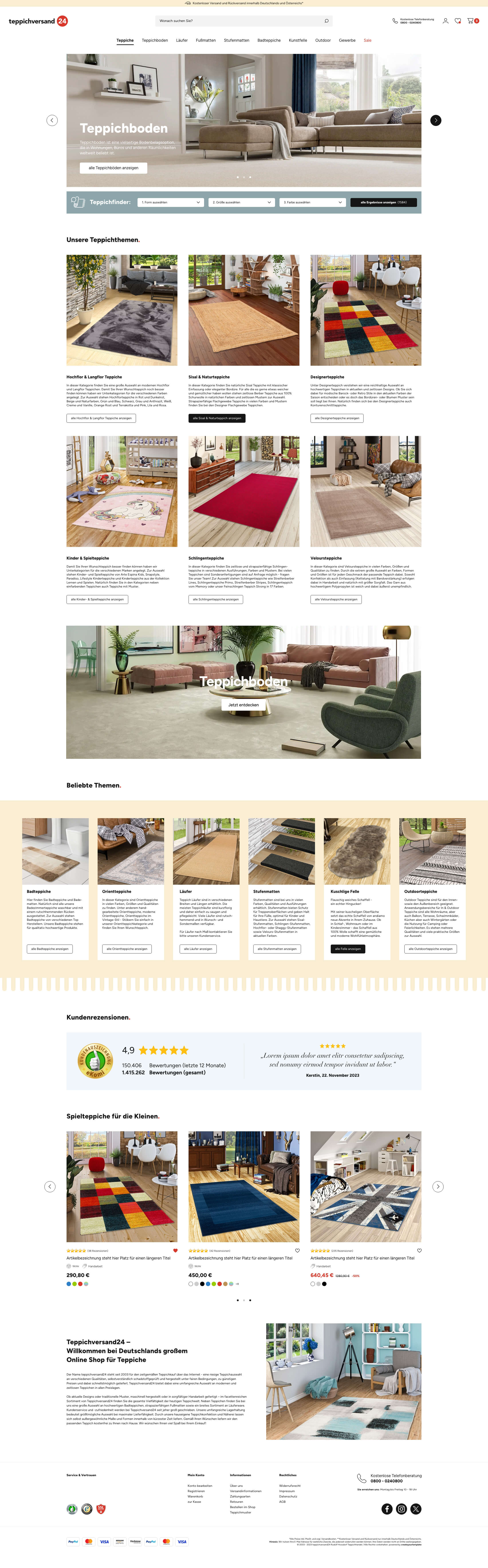 Als etablierter Online-Anbieter hat sich Teppichversand24 über viele Jahre als verlässliche Marke für anspruchsvolle Teppichkäufer etabliert und zählt einen großen nationalen wie internationalen Kundenkreis. Ziel des aktuellen Relaunchs war es, die Markenidentität zu stärken: Ein klarer, zurückhaltender Webauftritt soll die Vielfalt der professionellen Produktfotos in Szene setzen und Kunden eine stressfreie und transparente Einkaufserfahrung bieten. Omnipräsent im Shop ist der Teppichfinder, der nahezu intuitiv zur individuellen Teppichauswahl führt.
