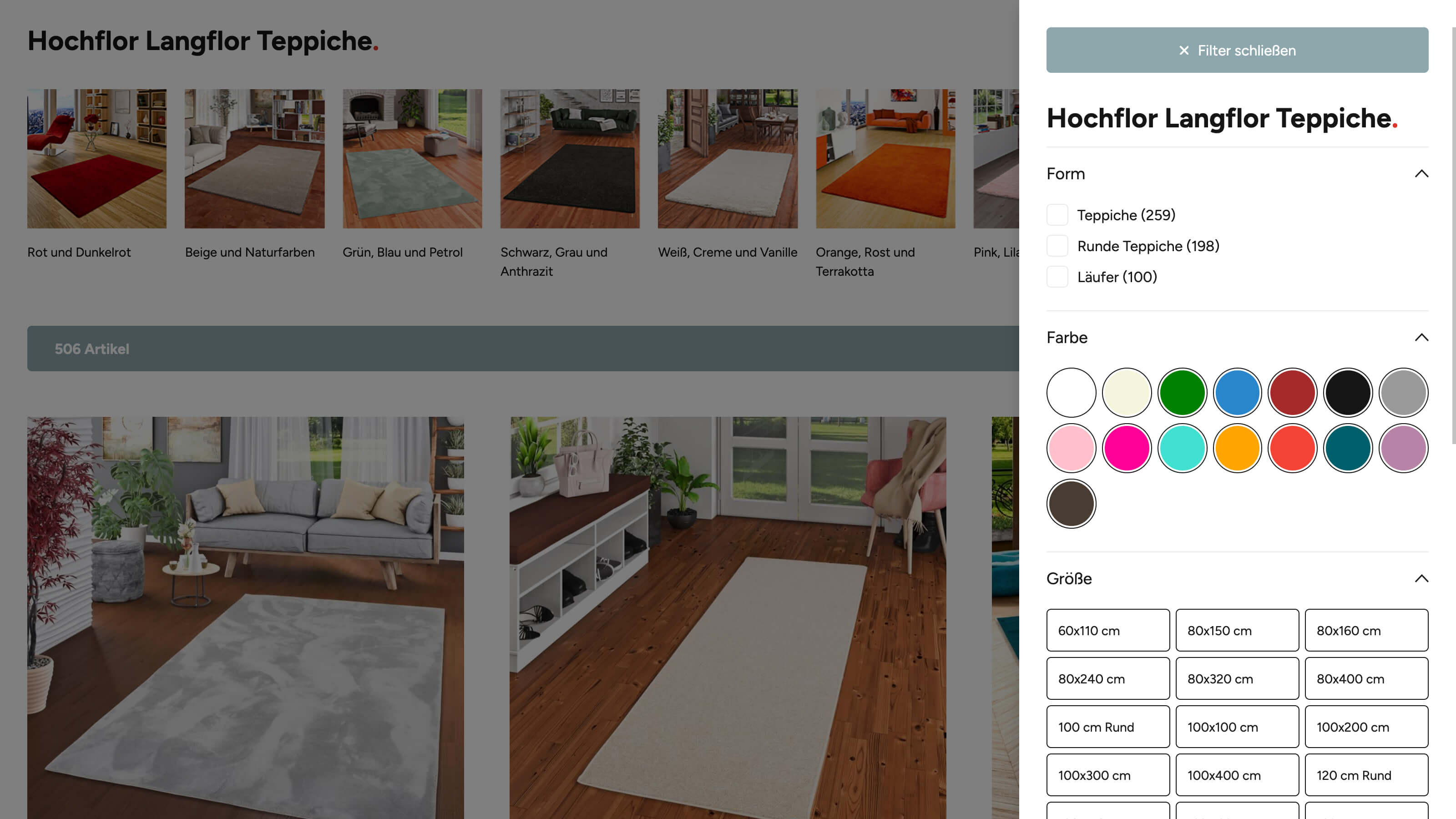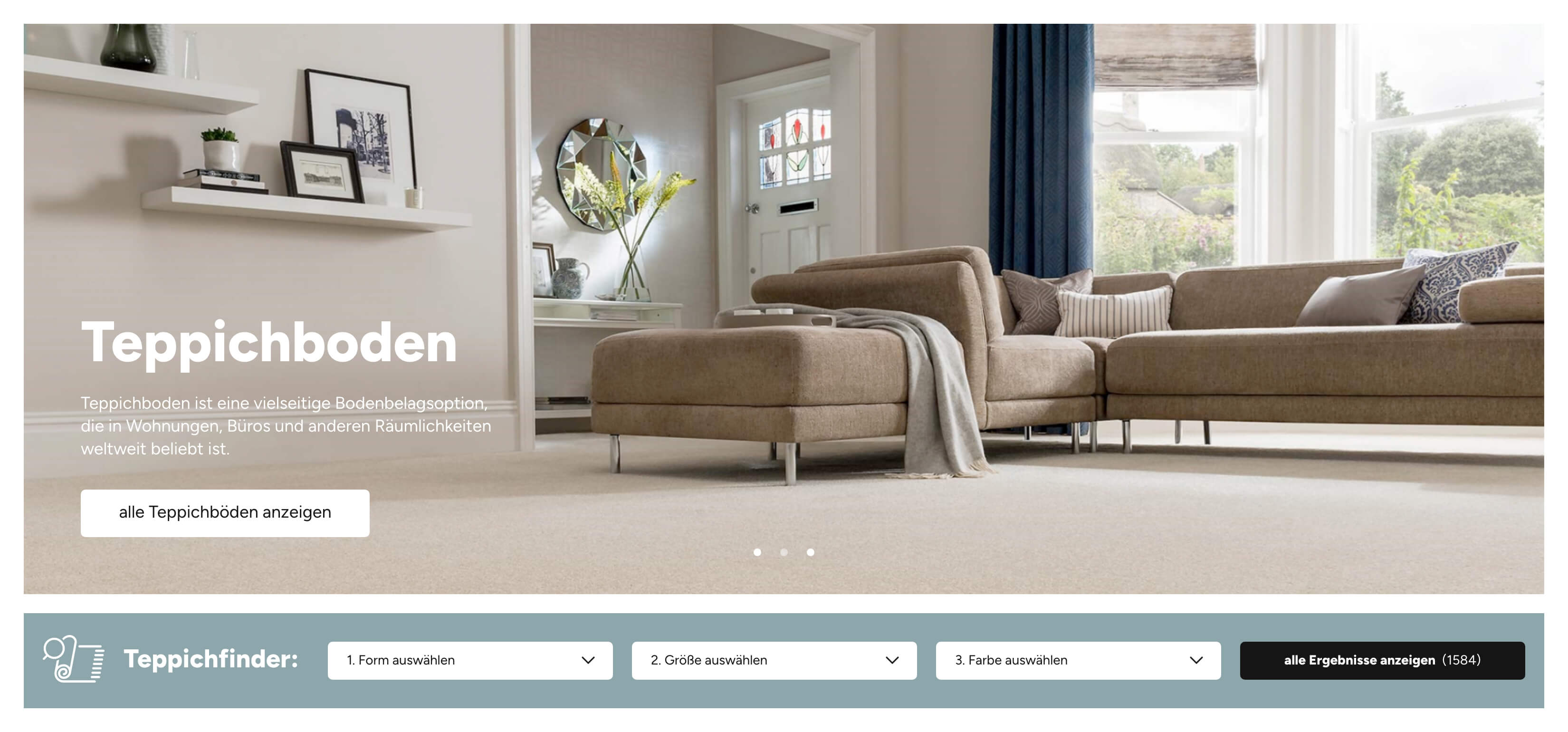 Das neue Shop-Design ist bewusst zurückhaltend gewählt und lässt den professionellen Produktfotos und den Teppichen selbst viel Raum. Dank klarer Filter und Kategorien genießen die Kunden einen entspannten und transparenten Kaufprozess, ohne jegliches Gefühl der Überforderung. Der Teppichfinder steht im Mittelpunkt und bietet einfache Orientierung – für jeden Einrichtungsstil und Bedarf. Internationale Kunden schätzen das große Sortiment und die reibungslose Navigation durch den Shop.
